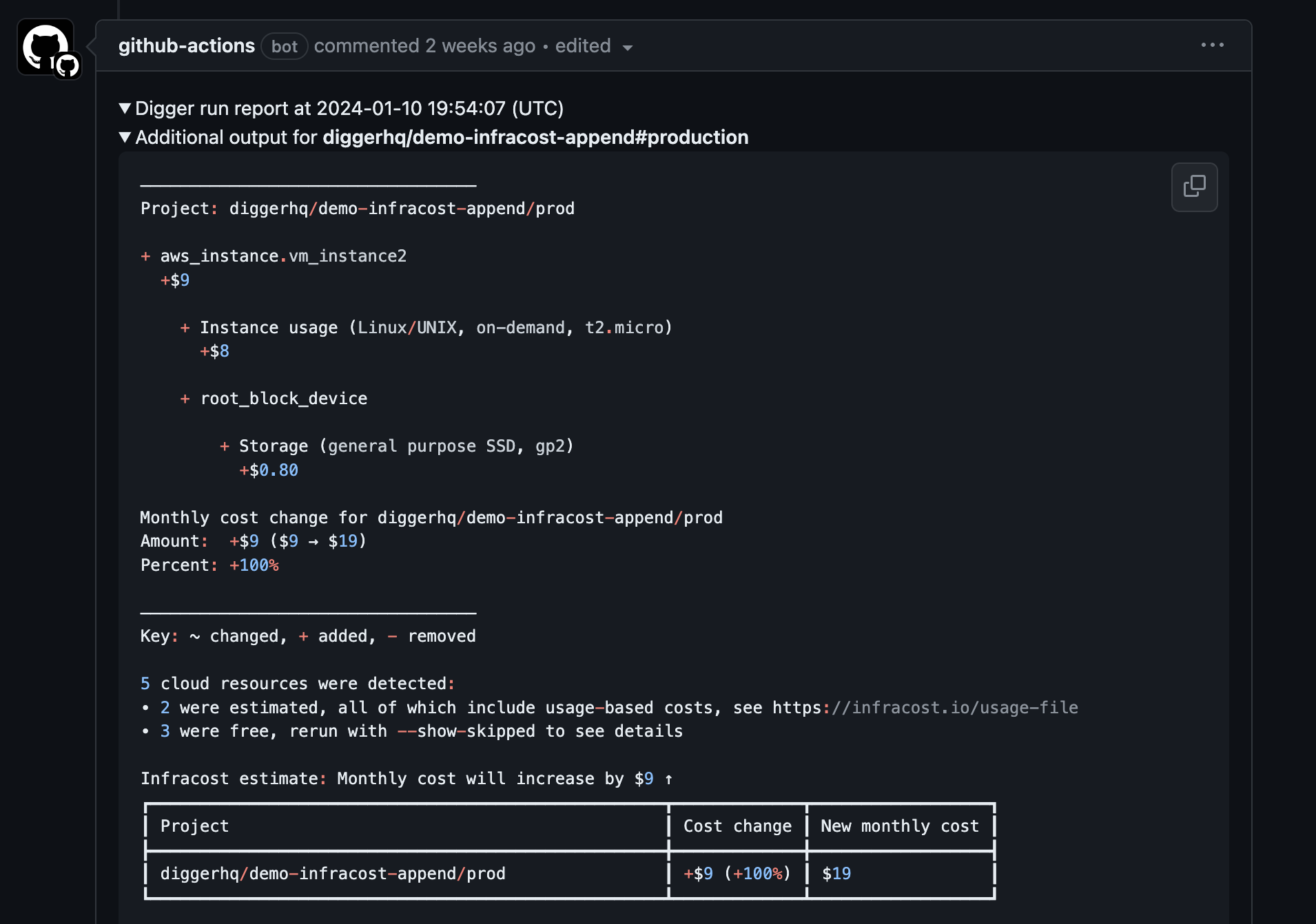 Forinfracost diff we’d need to run Infracost twice: first to generate the breakdown on the main branch, then to generate diff on the PR branch. To help with that, Digger provides additional environment variables like $PROJECT_NAME and $PR_BRANCH (see custom commands). You can then configure your workflow in digger.yml to switch branch to main, generate base breakdown, switch back to PR branch, generate diff and finally show it via $DIGGER_OUT, like below: