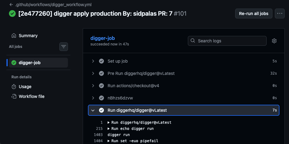 main.tf, digger.yml, and digger_workflow.yml, push a branch, and open a pull request.Confirm the Digger workflow runs in GitHub Actions and posts a plan comment on the pull request.